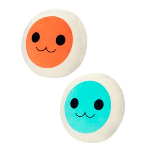 While both share the same iconic drum shape, Don-chan is the red-faced protagonist with a carefree personality, whereas Katsu-chan is his blue-faced brother. Collectors often seek them out as a pair to complete the “Don-Katsu” duo, though some limited-edition sets feature them as a single double-sided “face” cushion with one character on each side.